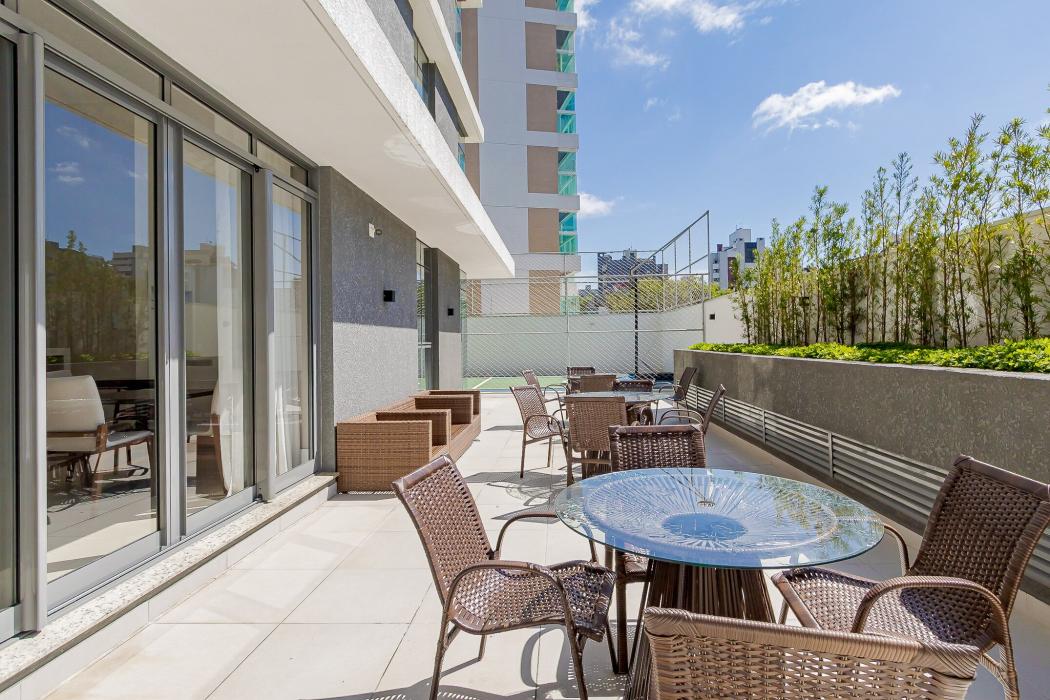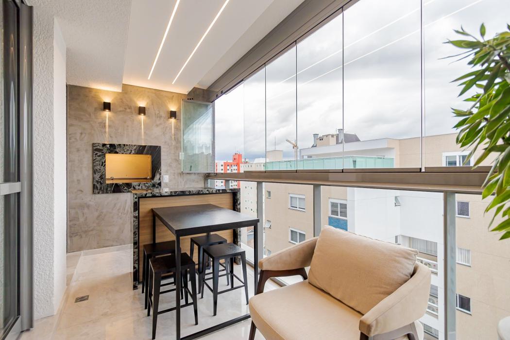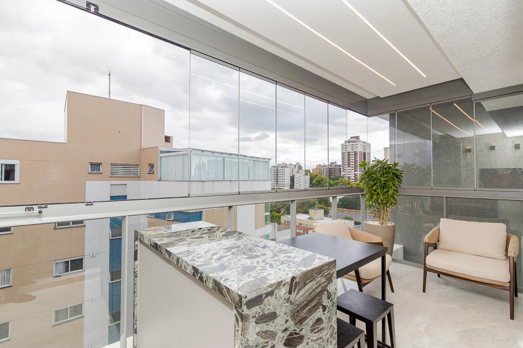- Sacada com churrasqueira e fechamento com cortina de vidro