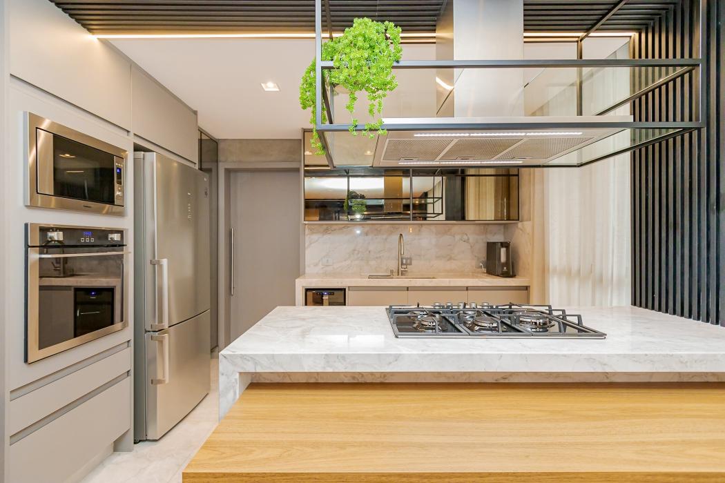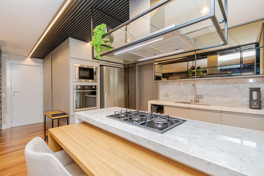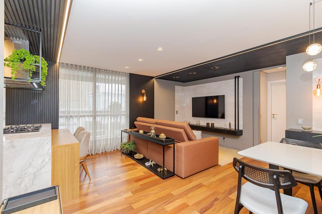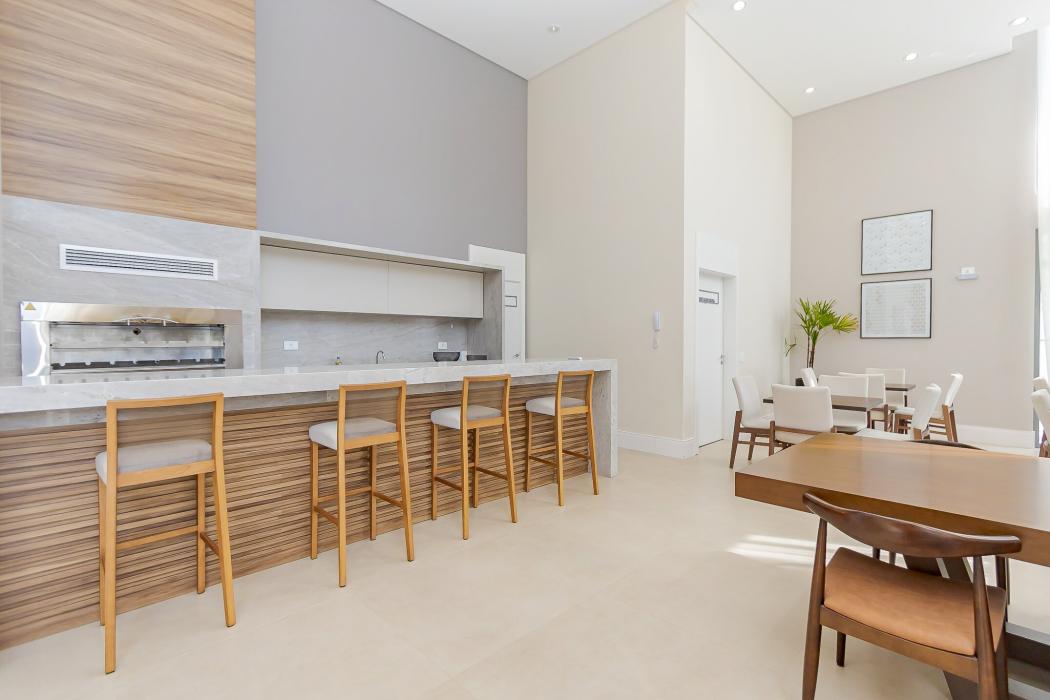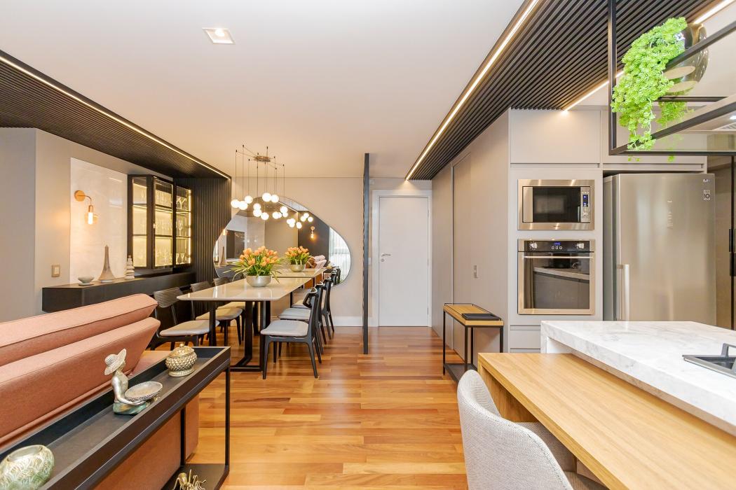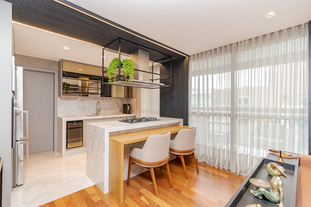 - Cozinha integrada com sala de jantar e TV