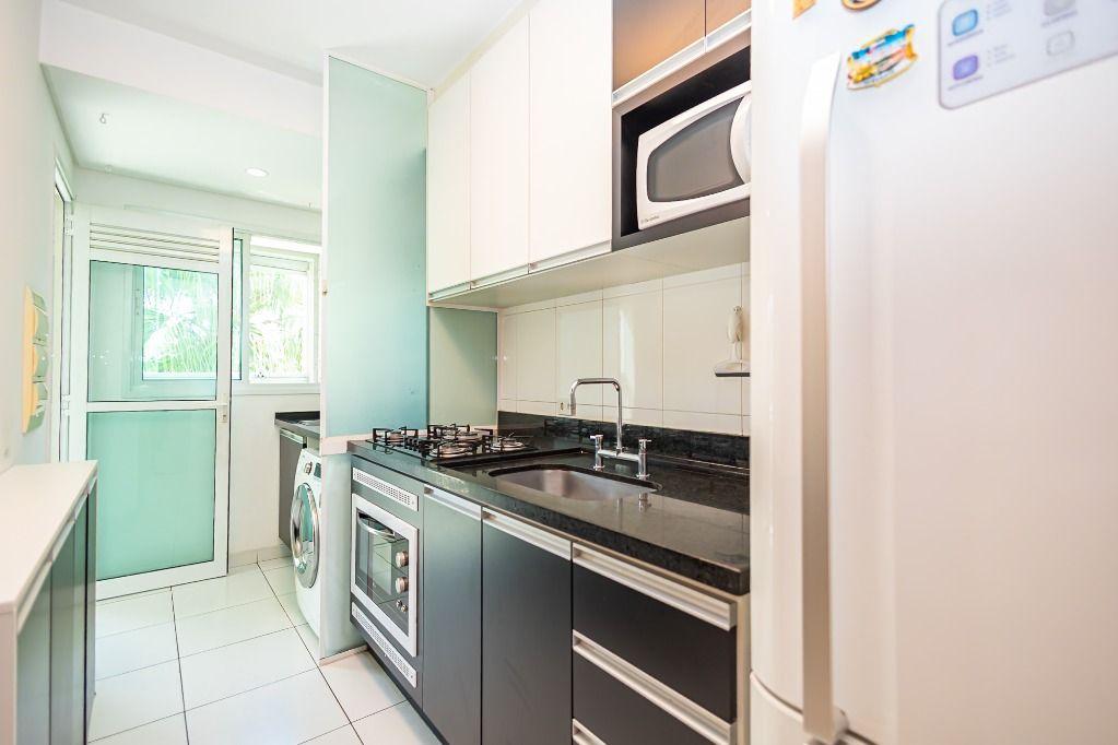A cozinha é completa, com armários planejados, cooktop e forno pronta para uso.
